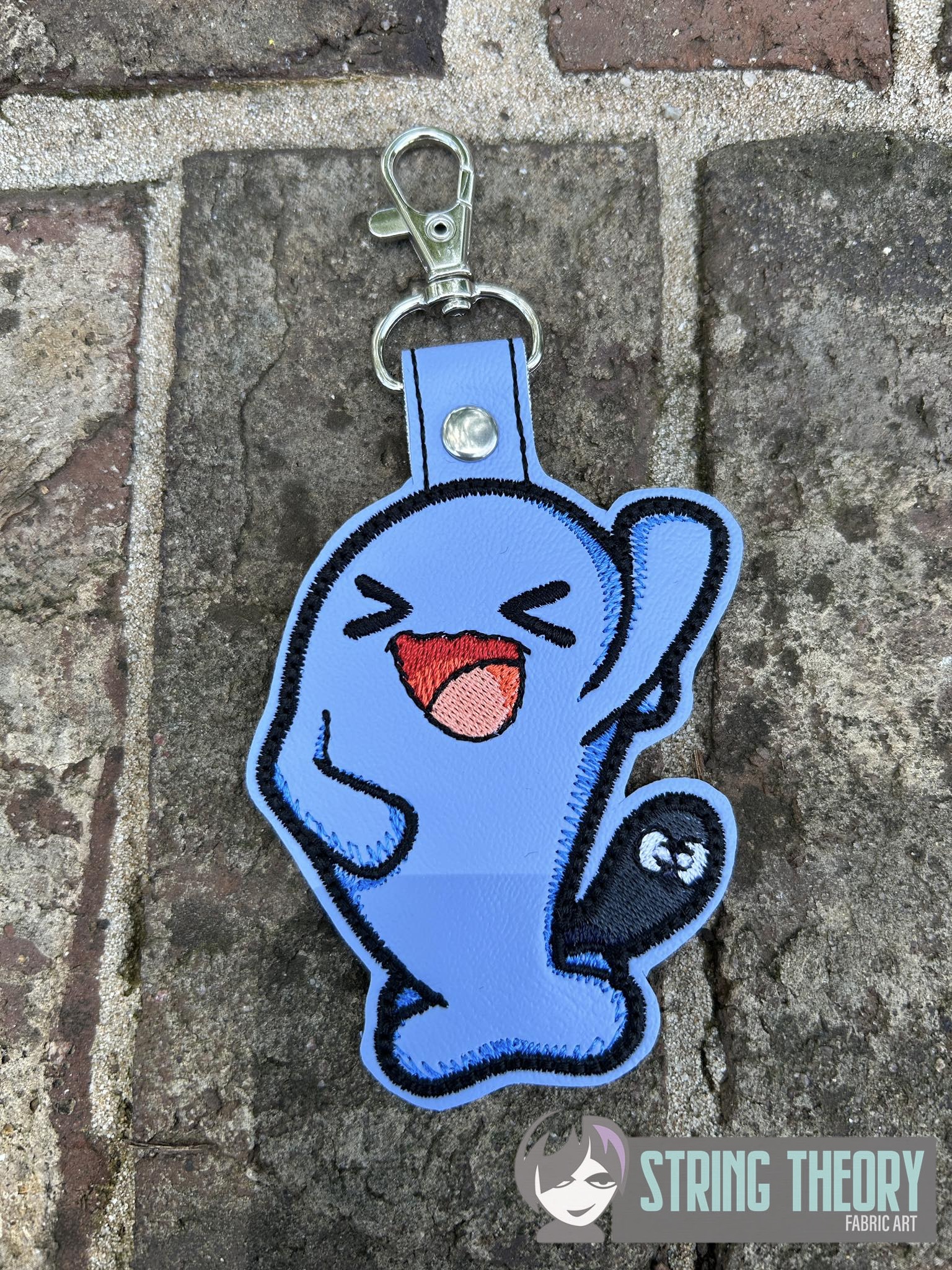 Fob measures approximately 2 9/16” x 3 1/8” with a ½” x 1 ½” tab to fold over the slip ring or lobster claw.
